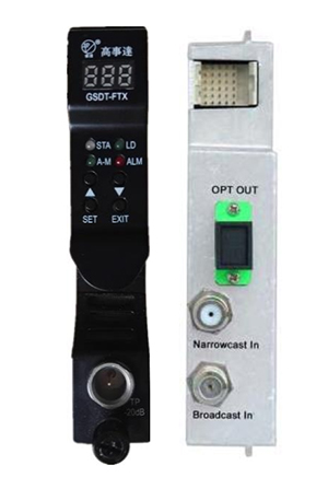 The GSDT-FTX-II-1550 forward transmitters are part of a new series in the Excelsior optical transmission platform that will mix with other GSDT-FTX series to integrate into the same GSDT-link Chassis. The module contains a high performance, advanced pre-distortion circuitry achieves superior CSO and CTB, and ideal for broadcast and narrowcast applications. It can provide a wide range of optical output power to deliver both analog and digital signals. All configuration parameters of modules can be monitored by LED screens on the front panel of the module, or by the GSDT-EMS equipment management module.