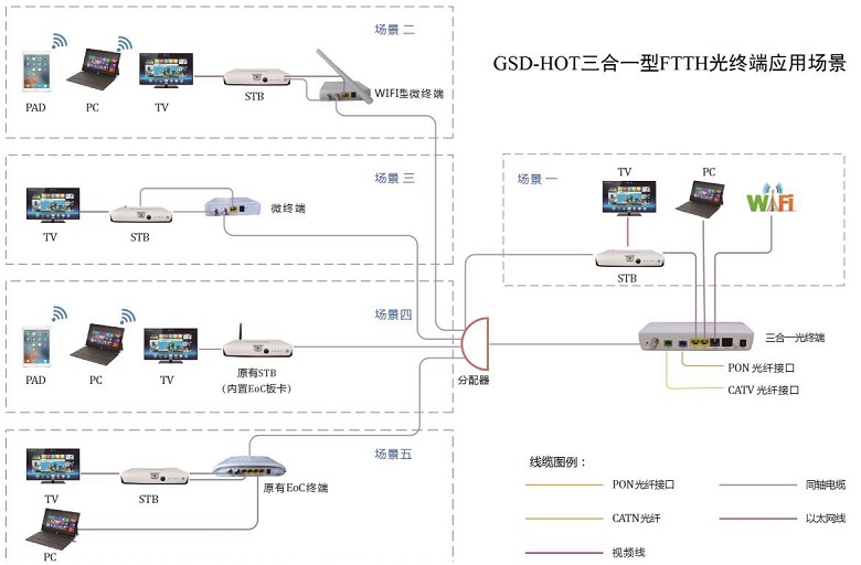 GSD-HOT 三合一型 FTTH 光終端是一款內(nèi)置了 CATV 及 ONU 光模塊和同軸電纜調(diào)制解調(diào)模塊的無源光網(wǎng)絡終端。該產(chǎn)品基于成熟穩(wěn)定的 EPON 技術,并融合了千兆以太網(wǎng)交換技術和同軸電纜網(wǎng) EoC 技術,不僅系統(tǒng) 可靠性高,而且組網(wǎng)部署方便,為 FTTH 網(wǎng)絡光纖入戶后駁接室內(nèi)原有的同軸電纜網(wǎng)絡提供了一個便捷的 解決方案,使原有的 EOC 網(wǎng)絡設備(包括 EOC 終端和內(nèi)置 EOC 模塊的雙向機頂盒)在不做任何改動的 情況下,就能方便地接入新建的 FTTH 網(wǎng)絡,并能同時支持寬帶上網(wǎng)和 VOD 點播等多個業(yè)務。